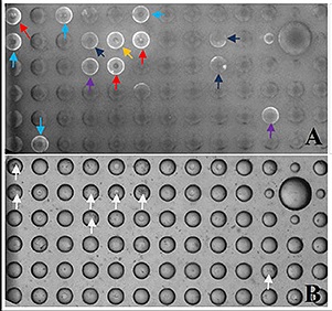 in (B) indicate MB wells with more than 8 cells. The bright fluorescent ring signals (A) indicate MBs with strong IgG secretion from SA13 cells, but also the ability to detect different levels of IgG production from these cells as indicated but the differing brightness of the fluorescent ring signals. Cells are recovered from individual MB wells using micro-manipulation tools for further characterization and work up e.g, Ig PCR amplification, gel analysis, cloning, scale up and validation.