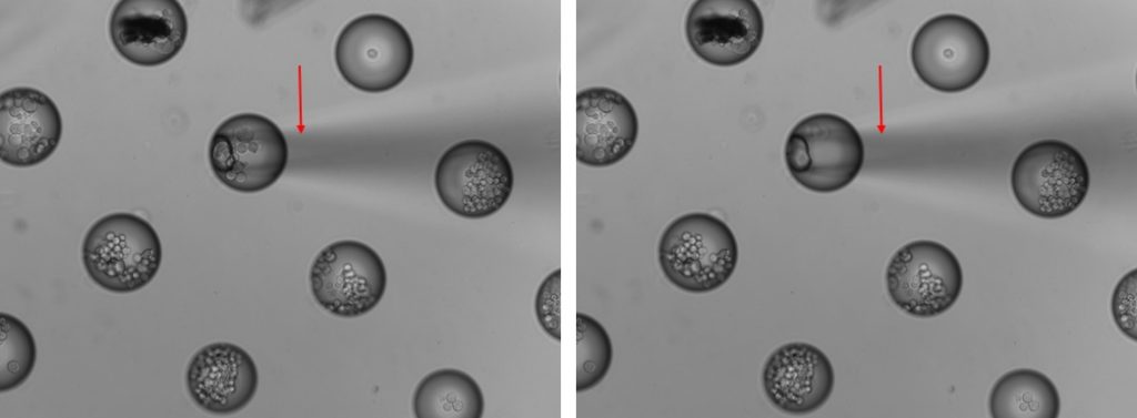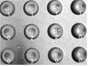 In this type of application cells are seeded at low concentration into large arrays with smaller MB features. Cell seeding follows a Poisson distribution so the concentration can be adjusted to maximize the number of MBs that contain single cells. The image shows the